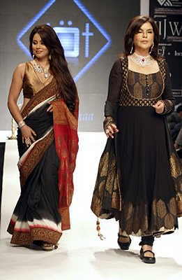 Kolkata, Aug 5: Yesteryear’s glamour queen 59-year-old Zeenat Aman who was the showstopper at the ongoing India International Jewellery Week (IIJW) looked much more stunning and glamorous than the 38-year-old Mahima Chaudhary, who also was a showstopper. Zeenat adorned an anarkali teamed with a diamond and ruby necklace while Mahima dazzled in a black saree with red and gold borders and a diamond neckpiece.