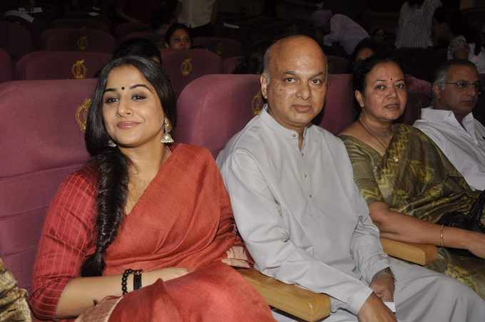 Post her Cannes stint, it seems Vidya Balan is back to her normal routines. Also, looks like she's too fond of Indian traditional music. Last week, she was at a classical music evening with her family, and this week, she attended Zakir Hussain's concert, which was a tribute to Shafaat Ahmed Khan. Along with Vidya Balan, Zakir Hussain, Bollywood director Ashutosh Gowariker was also present at the evening. This time, Vidya sported a rather plain saree, light makeup, a pair of dangling earrings and completed her look with a side swpet, fishtail braid.