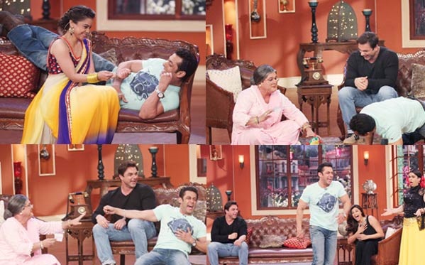 And looking at the pictures, it’s quite evident that the Dabangg Khan had one helluva time. SK just couldn’t control his laughter and is seen going all LOL, ROFL, LMAO and what not. That’s not all. Salman seems to be so happy to be that he is seen giving jaadoo ki jhappis to everyone, especially the ladies – everyone from Sumona Chakravarti to Shweta Tiwari were lucky girls who got a warm bear hug from the Jai Ho star. The episode of funny ha ha series featuring Salman will not only having the flavour of comedy, but it will also have a tadka of romance and some naach-gaana it seems.